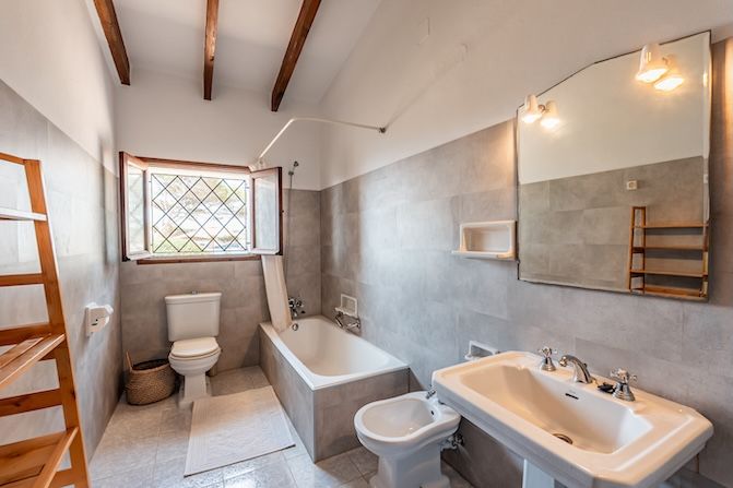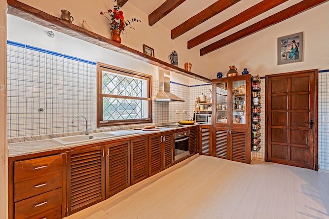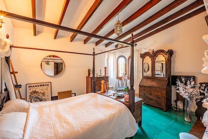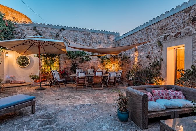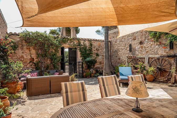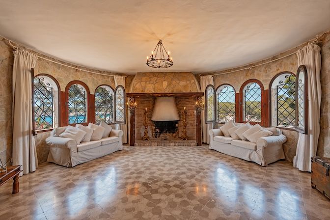 The architecture combines traditional Mallorcan craftsmanship with distinctive mid-century design. Two circular stone towers define the property: one residential with elevated 300-degree panoramic views, and one housing a handcrafted Santanyí stone spiral staircase. Natural stone walls, arched verandas, wrought iron detailing, and carved lintels add to the visual richness.